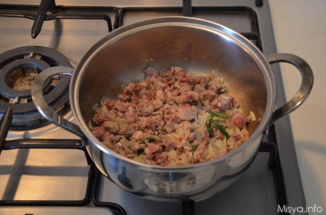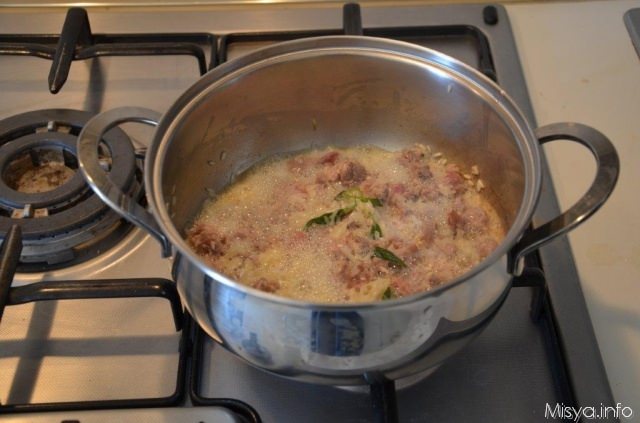 Appena il burro si sarà sciolto, aggiungere la salsiccia sbriciolata e fate rosolare anch'essa.