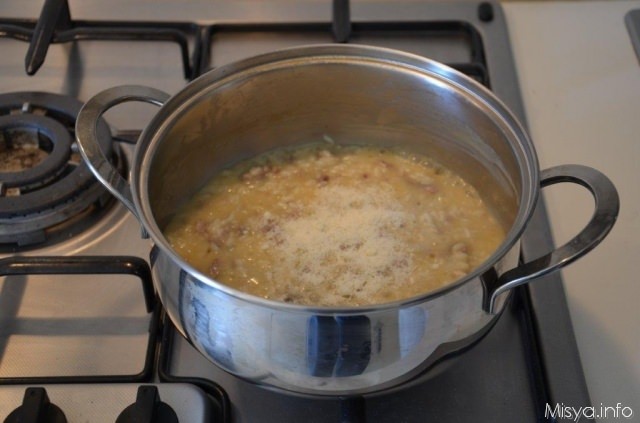 A cottura ultimata,spegnere la fiamma, e mantecate aggiungendo il parmigiano grattugiato.