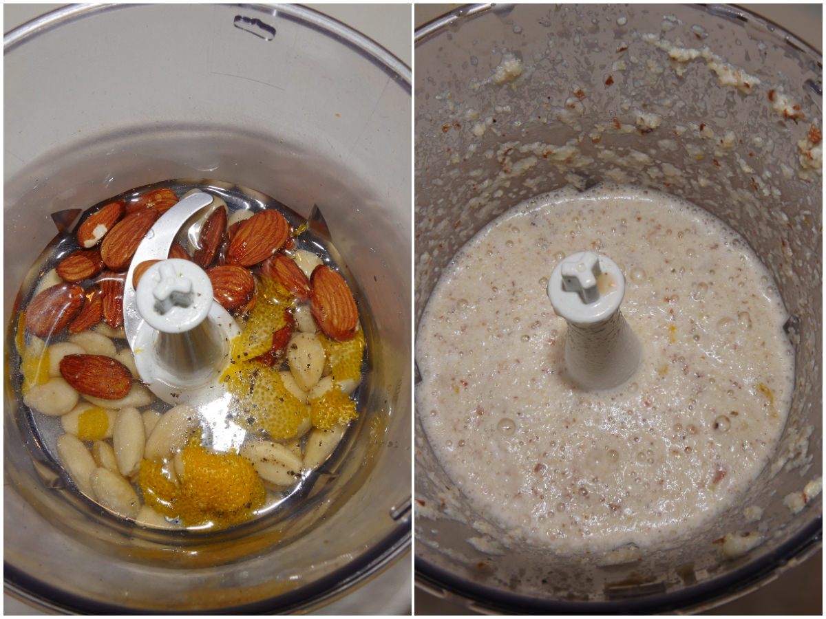 Mettete in un mixer le mandorle (io ne ho usate metà pelate e metà sgusciate, vanno bene entrambe), la buccia del limone e l'acqua e frullate.