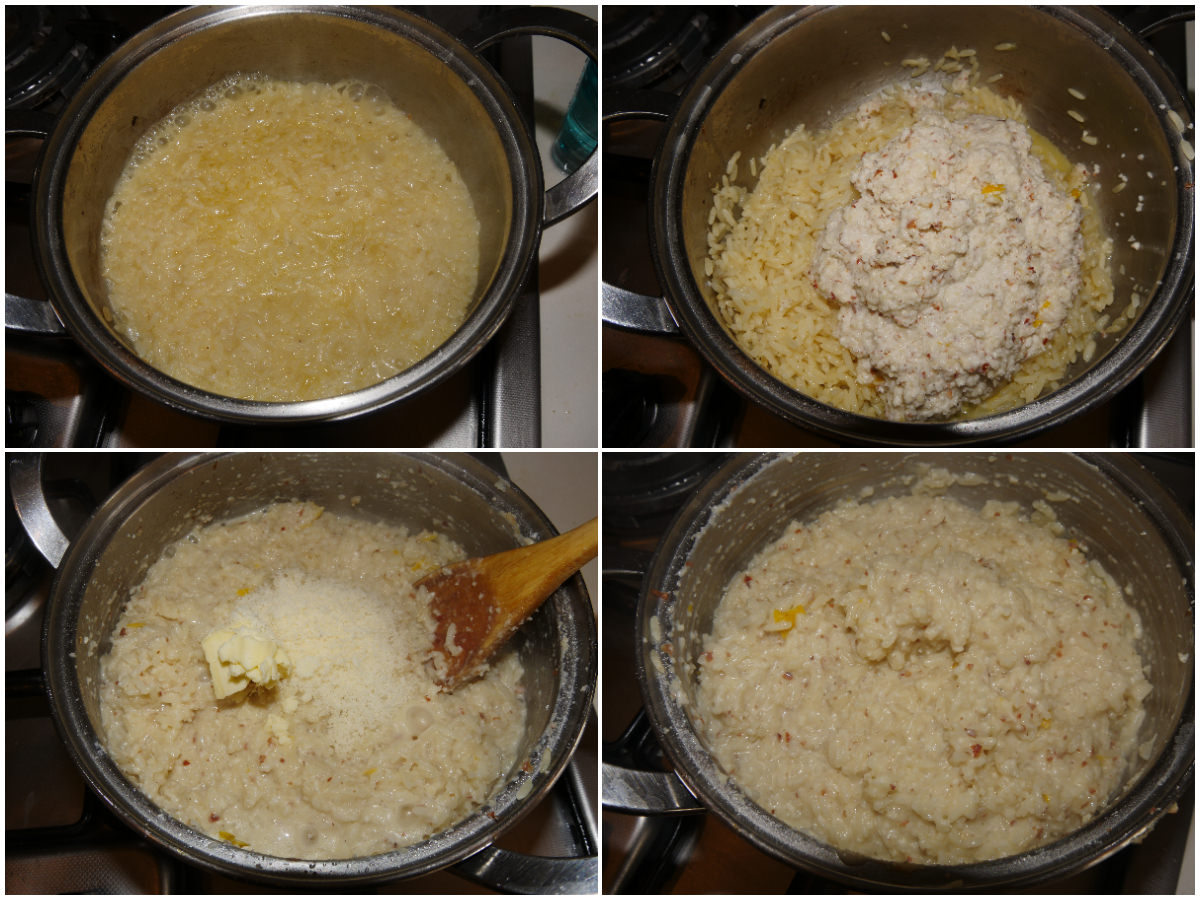 Arrivati quasi a fine cottura del riso, aggiungete la crema di mandorle e limoni, quindi mantecate con burro e grana.
