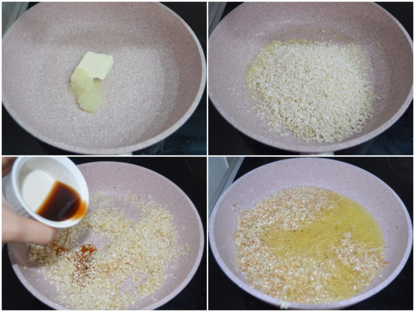 Una volta evaporato il vino iniziate la cottura aggiungendo il brodo caldo un mestolo per volta, mescolando spesso.