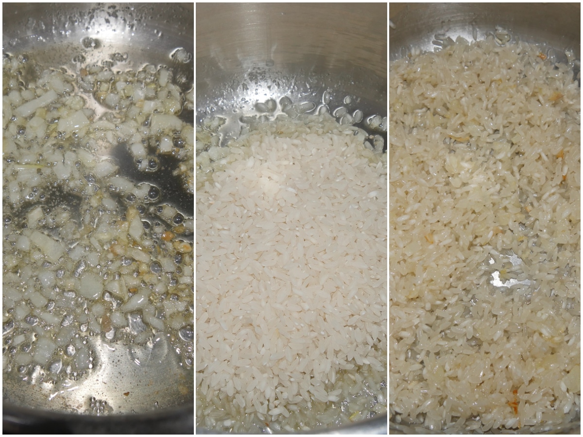 Tritate la cipolla e fatela appassire con un po' di burro, quindi unite anche il riso e fatelo tostare finché non inizierà a diventare trasparente.