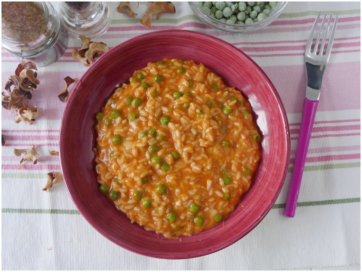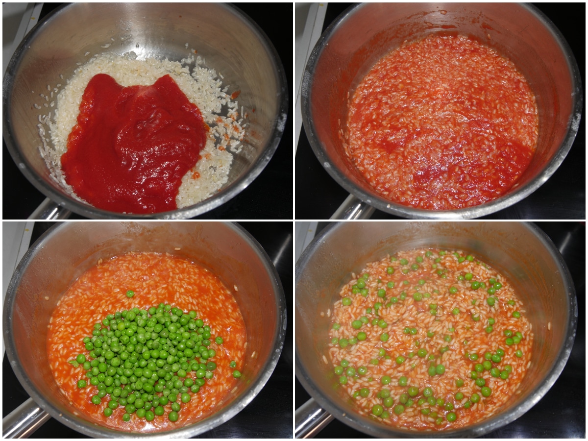 Aggiungete la passata e il brodo e iniziate a cuocere il riso: a metà cottura aggiungete anche i piselli e chiudete con coperchio.