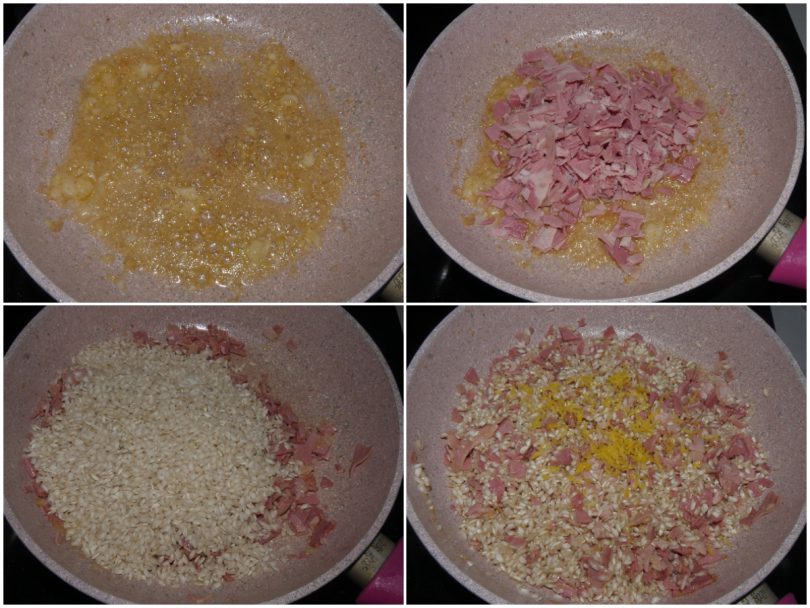 Fate rosolare nel burro il prosciutto tagliato a listarelle insieme alla cipolla ttritata finemente.Aggiungere il riso al condimento e fatelo tostare poi unite la buccia di limone.