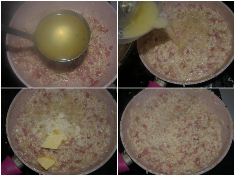 Bagnate quindi il riso con il vino bianco e quando sarà sfumato, cuocere il risotto per una quindicina di minuti, unendo il brodo bollente 1 mestolo per volta man mano che il risotto si addensa. In ultimo aggiungete il succo di limone.A cottura ultimata, mantecare il risotto prosciutto e limone con una noce di burro, il parmigiano e la scorza di un limone grattugiato.