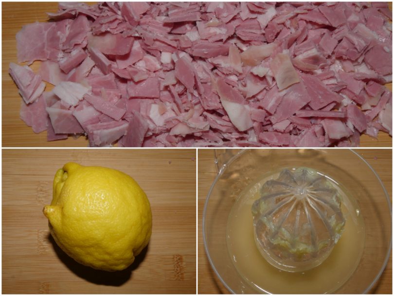 Preparate il brodo vegetale oppure fate bollire un dado in un litro di acqua. Tritate il prosciutto e grattugiate la buccia del limone e ricavatene poi il succo.
