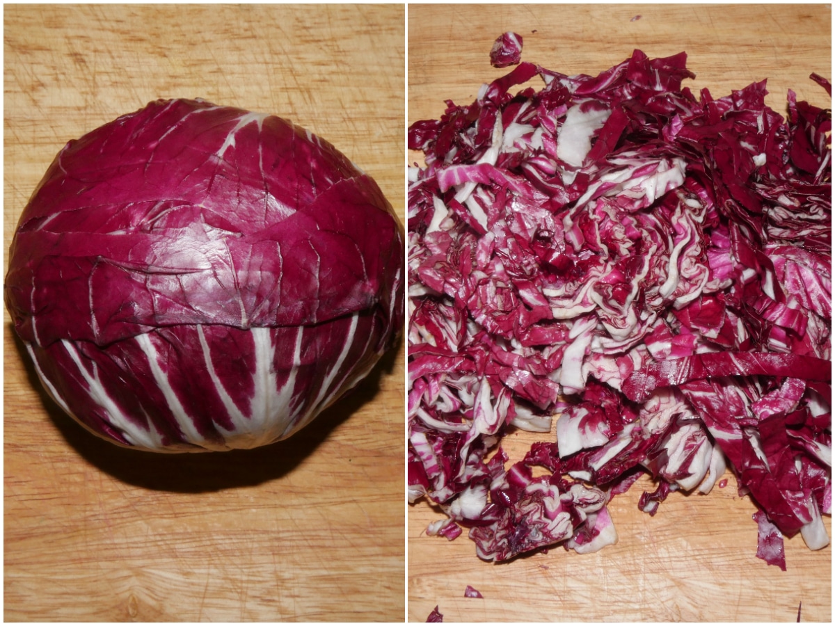 Mondate e lavate il radicchio, quindi tagliatelo a listarelle.