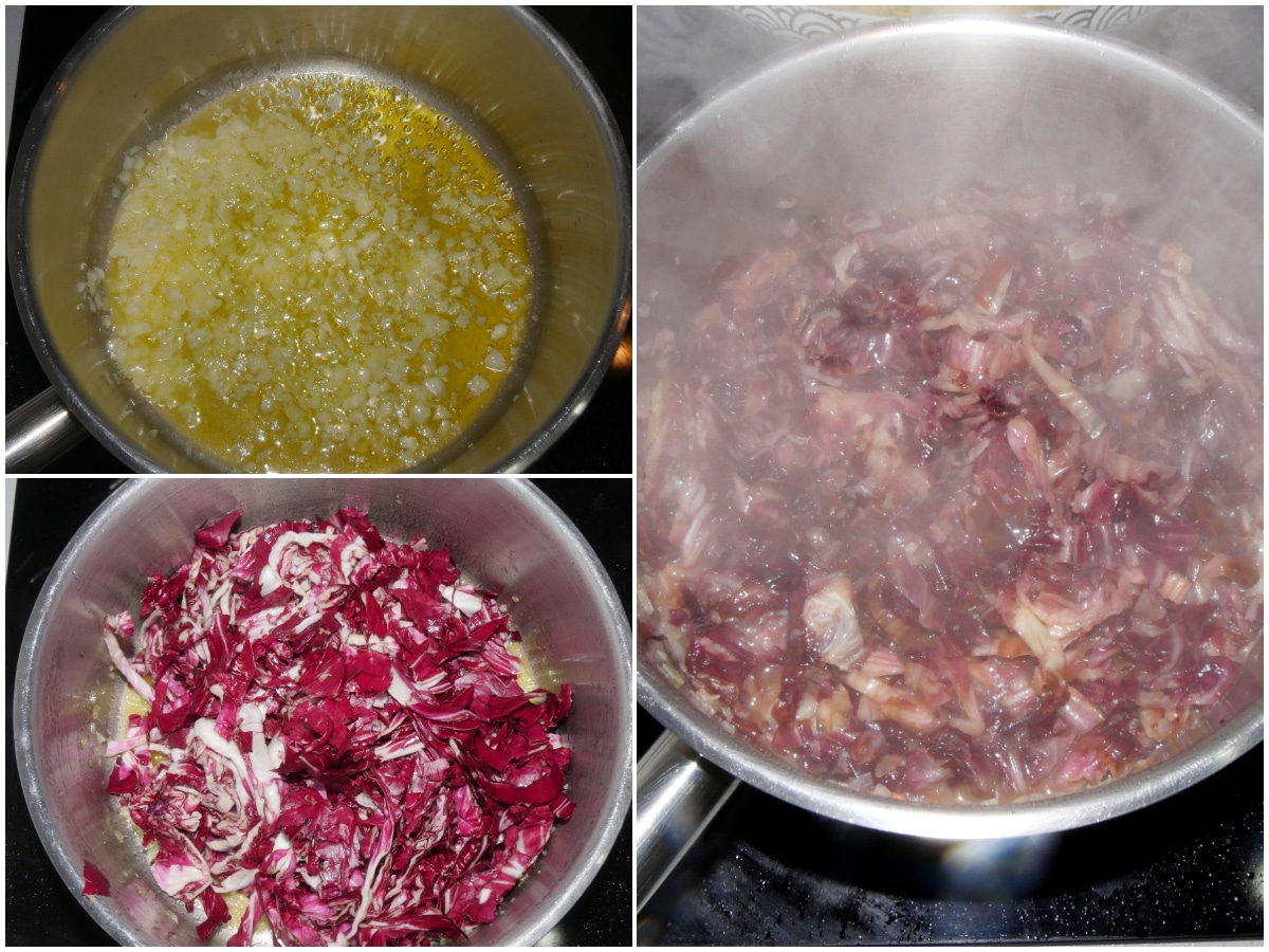 Fate appassire la cipolla tritata con olio in una casseruola, unite il radicchio, fatelo insaporire brevemente e poi stufatelo con 1 mestolo di brodo caldo.