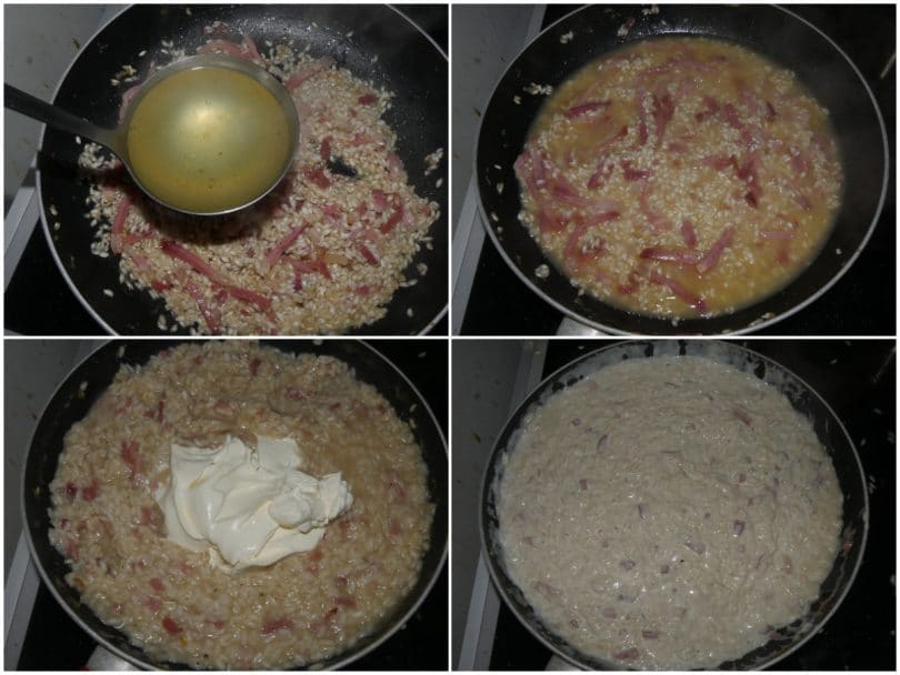 Mescolare quindi aggiungere il brodo bollente un mestolo per volta man mano che viene assorbito dal riso