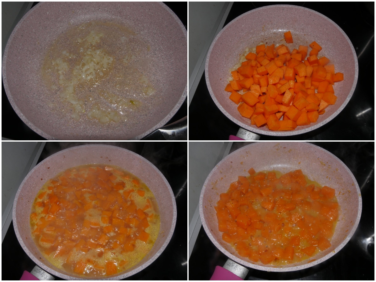 Tritate finemente la cipolla e fatela appassire con una noce di burro, quindi unite anche la zucca, coprite con 1 mestolo di brodo e cuocete per circa 15 minuti: a fine cottura la zucca dovrà aver almeno iniziato a sfarsi.