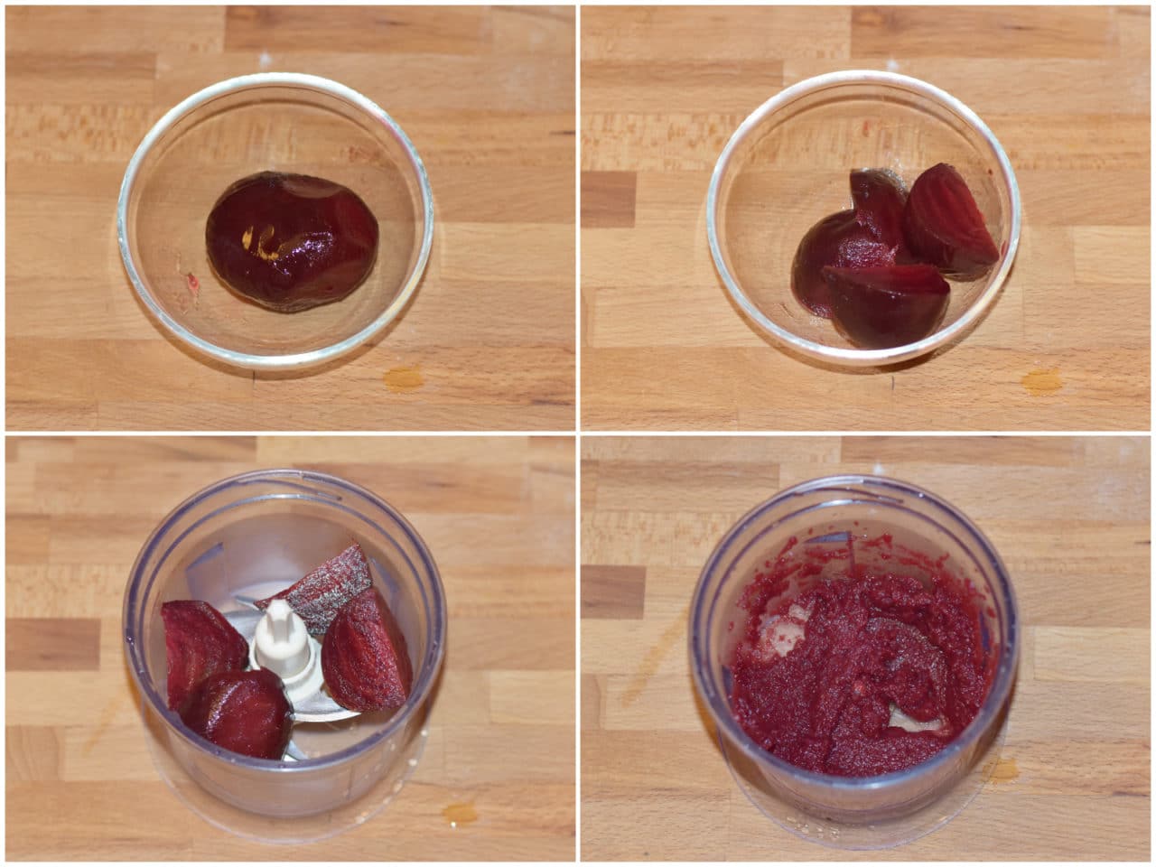 Innanzitutto tagliate la barbabietola a pezzi e frullatela fino ad ottenere una crema liscia.