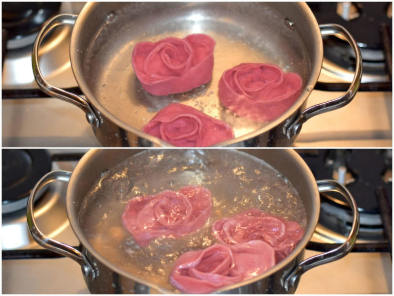 Cuocete le rose di ravioli in acqua bollente leggermente salata per circa 3 minuti, facendo attenzione a non farli attaccare tra di loro.