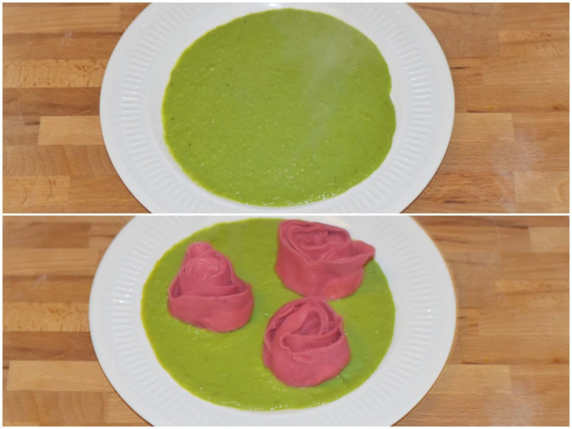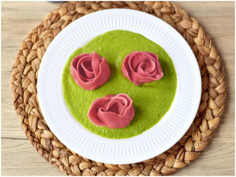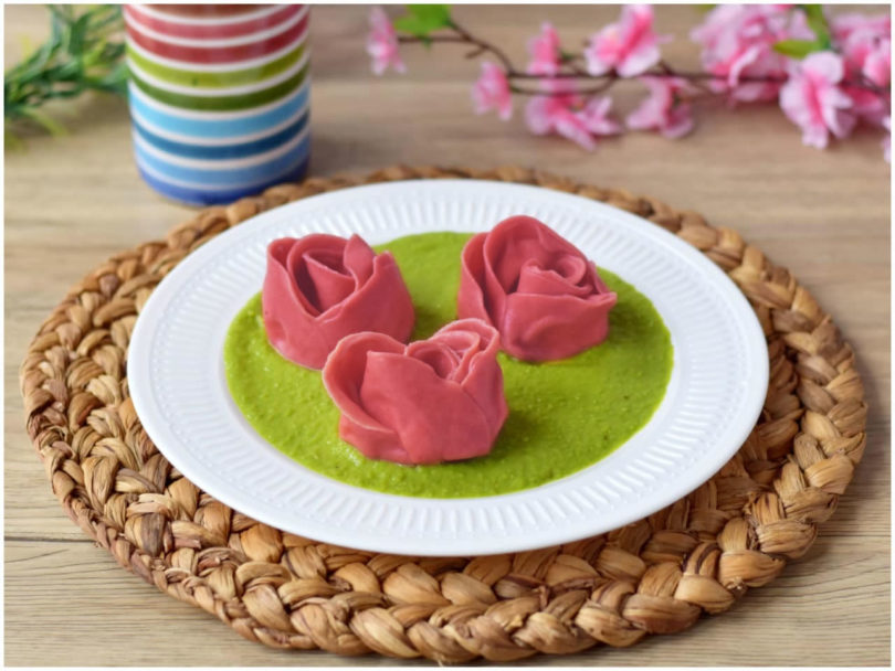 Quella per preparare le rose di ravioli è una ricetta che ho visto qui e che mi ha conquistata all'istante. una gustosa fusione di pasta fatta in casa e sapori raffinati. La nostra ricetta si distingue grazie all'impasto rosa ottenuto dalla barbabietola, che conferisce alle rose un'eleganza senza pari. Queste piccole prelibatezze presentano un cuore cremoso di ricotta, aromatizzata con lime e paprica per un gusto deciso, e sono servite su di un letto di crema di piselli. non lasciatevi spaventare dal numero esiguo di rose nel piatto: ogni rosa è infatti composta da ben 5 ravioli. Se avete voglia di servire un primo piatto super scenografico e d'effetto, elegante ma anche saporito, provate queste rose di ravioli e non ve ne pentirete!