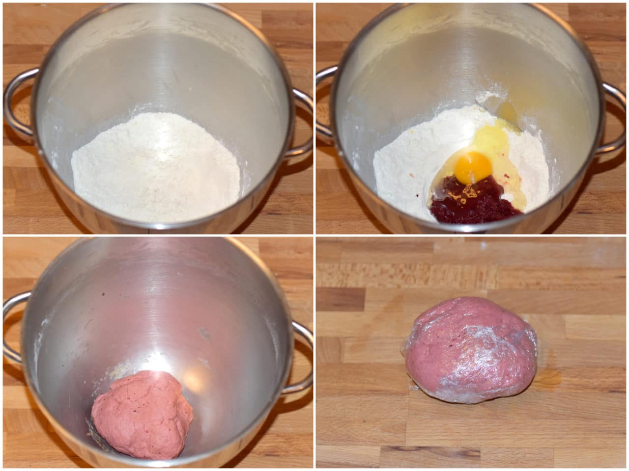 Unite in una ciotola farina, uovo, barbabietola e sale e lavorate velocemente fino ad ottenere un panetto omogeneo, quindi avvolgetelo con pellicola per alimenti e lasciate riposare a temperatura ambiente per almeno 30 minuti.
