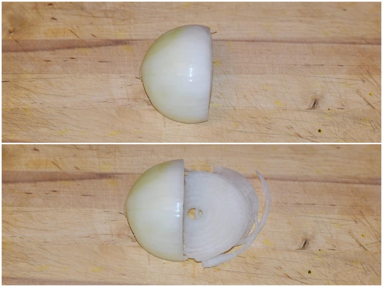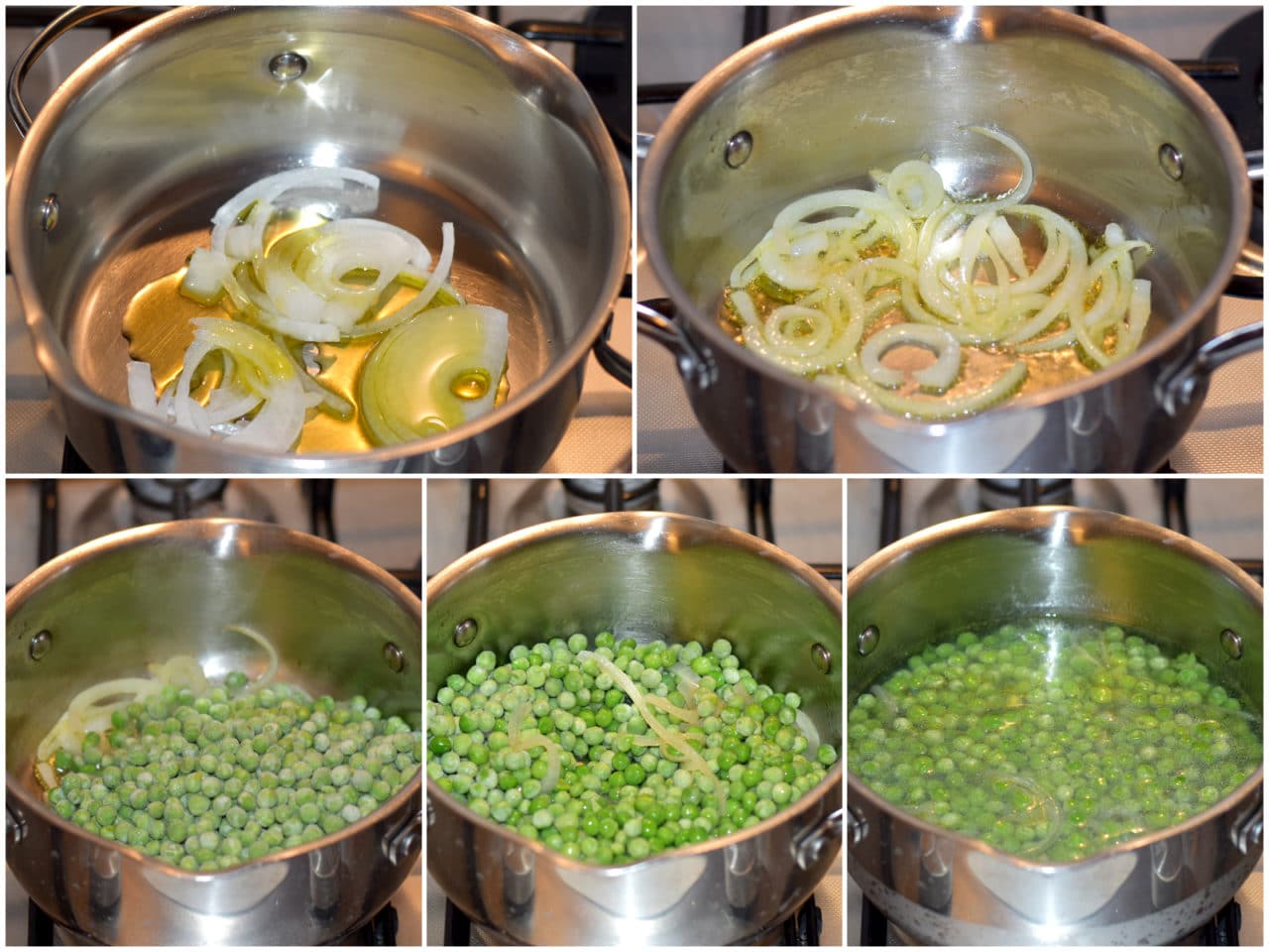 Nel frattempo iniziate a preparare la crema di piselli: mondate la cipolla e tagliatela a fettine sottili, fatela appassire in una casseruola con olio, poi unite i piselli.