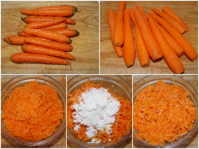 Lavate le carote, mondatele e grattugiatele con una grattugia a fori larghi.
