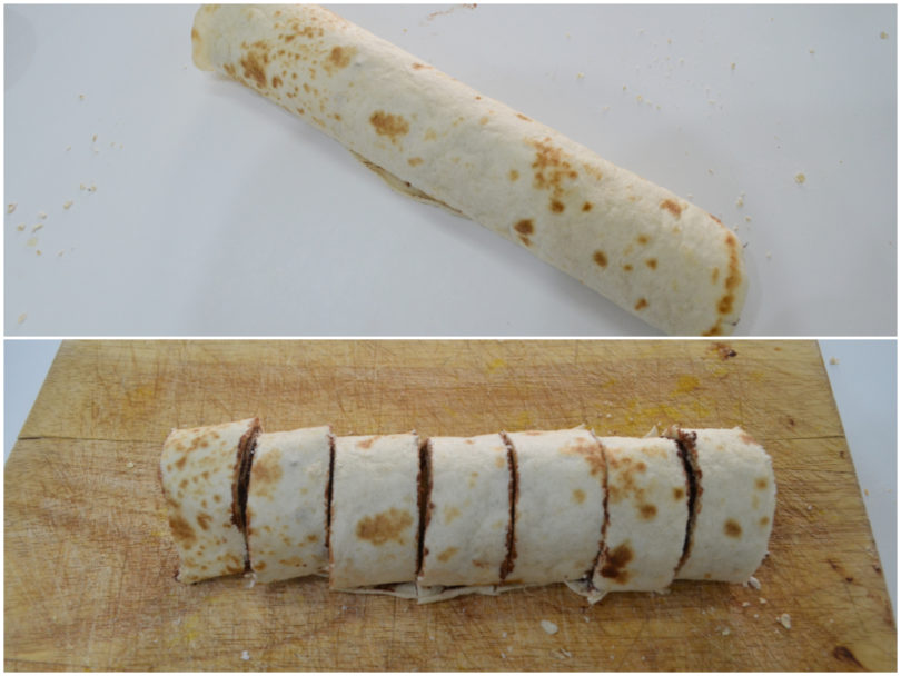 Partendo proprio dalla banana, arrotolate la piadina intorno alla banana, quindi tagliate a rondelline.