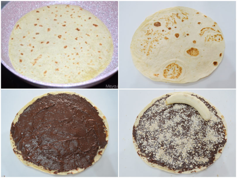 Stando attenti a non scottarvi, spalmate la nutella su un lato delle piadine.