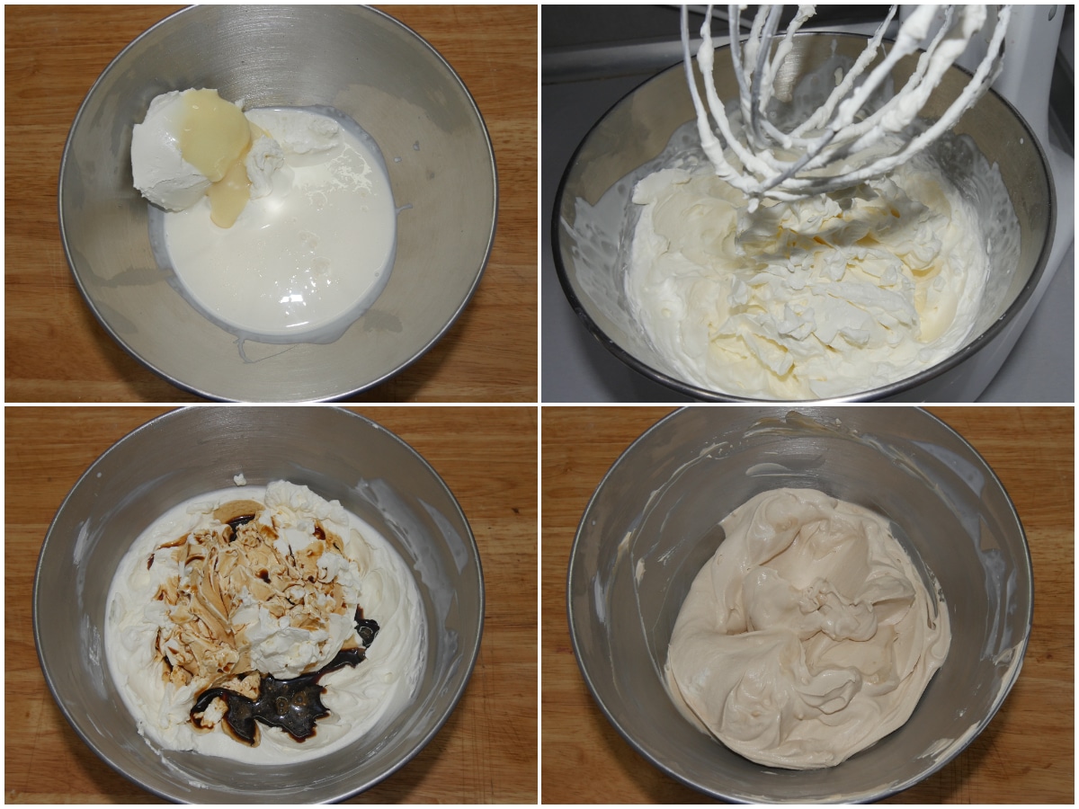 Quando la pasta biscotto sarà ormai fredda, preparate la crema al caffè: Montate la panna ben fredda di frigo direttamente con mascarpone e latte condensato (se non vi sentite sicuri, montate la panna da sola, stemperate il mascarpone con il latte condensato e solo in seguito unite i 2 composti), quindi incorporate il caffè, mescolando molto delicatamente per non far smontare il composto.