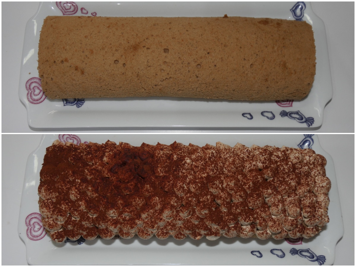 A questo punto potete assemblare il dolce: riprendete la pasta biscotto e apritela delicatamente; farcitela con la crema al caffè (potete lasciarne da parte 1/3 per la decorazione, se volete), arrotolate nuovamente (sempre aiutandovi con la carta forno) e lasciate riposare in frigo per almeno 2 ore.