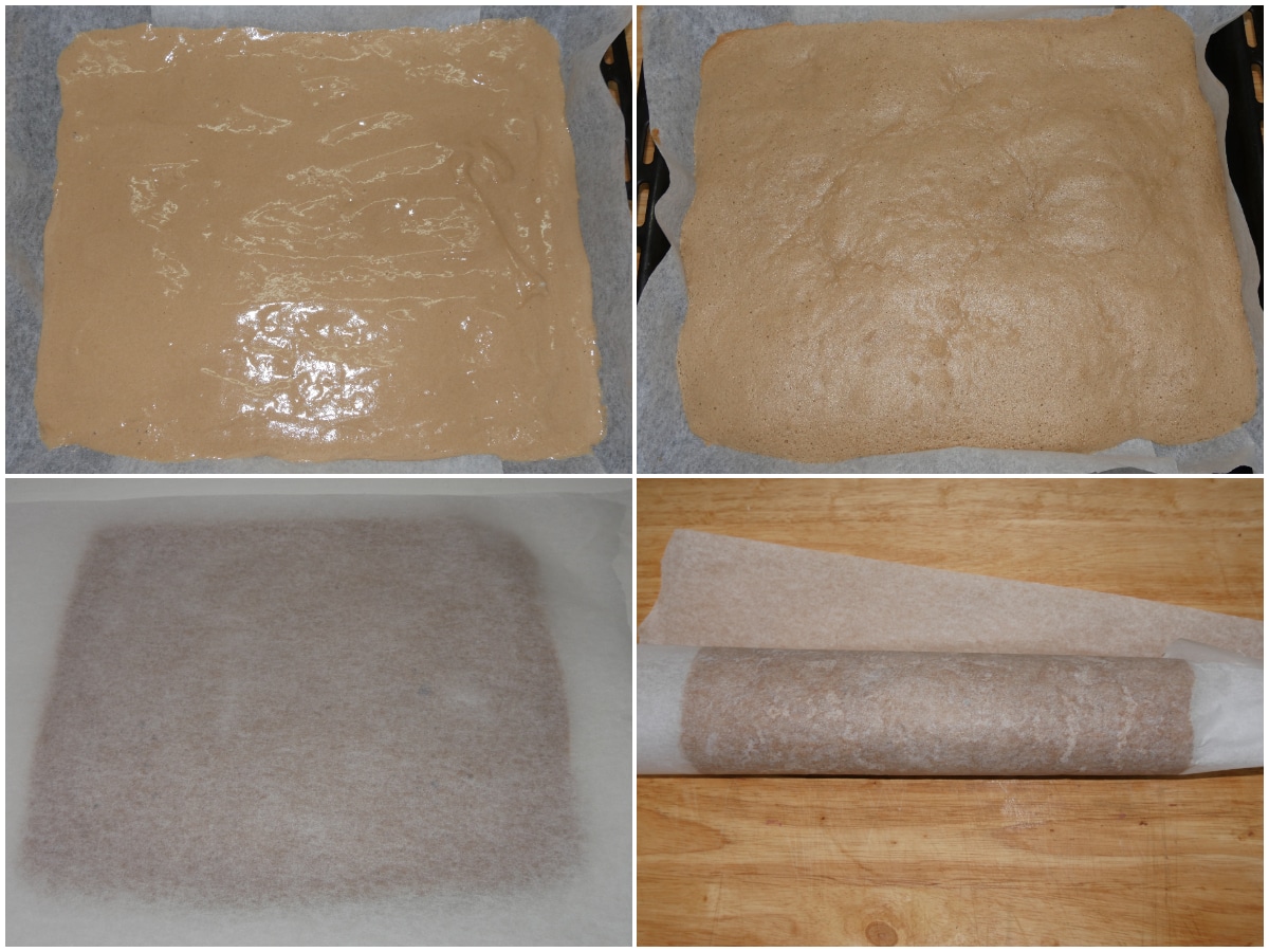Sfornate, capovolgete la pasta biscotto su un secondo foglio di carta forno, tirate via delicatamente il foglio usato per la cottura e arrotolate la pasta biscotto su se stessa, lasciandola raffreddare così.