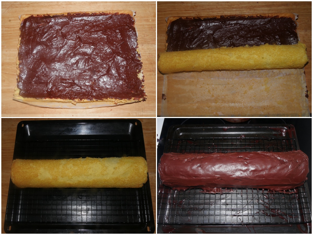 Arrotolate nuovamente, spostate su una gratella (o su un foglio pulito di carta forno) e rivestite con la ganache rimasta, quindi conservate in frigo per almeno 2 ore.