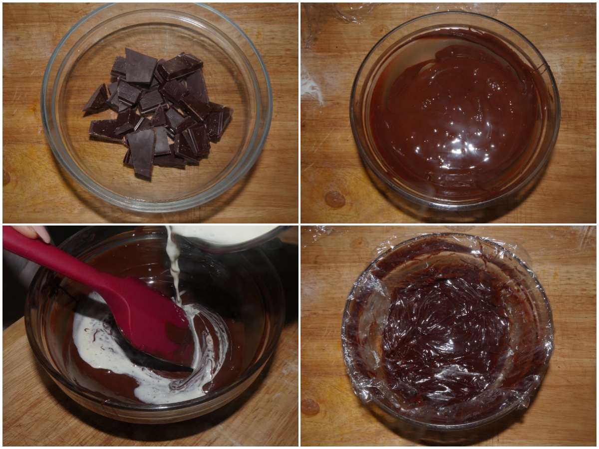 Nel frattempo preparate la ganache: portate la panna ad ebollizione, versatela sul cioccolato tritato e mescolate fino ad ottenere un composto liscio e omogeneo, quindi lasciate intiepidire.
