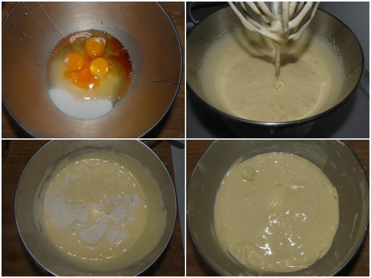 Preparate la pasta biscotto: montate molto bene le uova con lo zucchero e la vaniglia, poi incorporate anche farina e lievito setacciati.