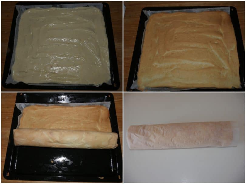 Stendere della carta oleata su una teglia da forno, versate il composto ottenuto e livellate il più possibile.Infornare la pasta biscotto a 180° e cuocere per10-12 minuti.Su una spianatoia disporre un foglio di carta oleata e rovesciare la pasta biscotto sopra, quindi,staccare delicatamente quella usata per la cottura.Coprire la pasta con un altro foglio di carta forno e arrotolarla mentre è ancora calda.