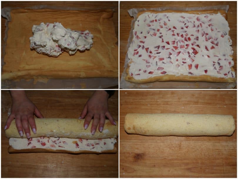 Una volta raffreddata, srotolarela pasta biscotto con delicatezza e stendere la crema ottenuta lasciando libero un bordo della pasta.Arrotolare quindi la pasta su se stessa, avvolgerla nella carta forno e riporre il rotolo alle fragole in frigo per almeno 3 ore.