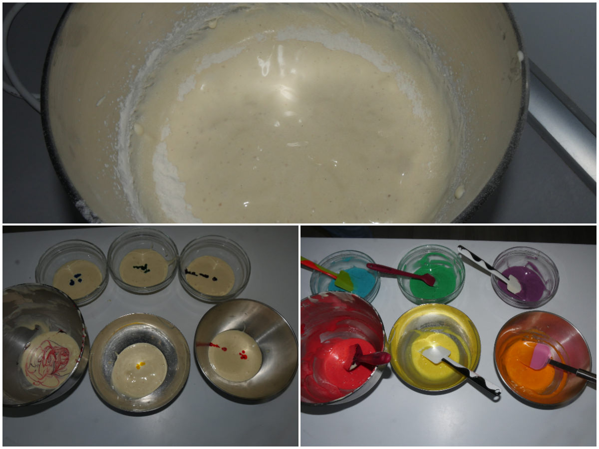 A questo punto colorate l'impasto dopo averlo diviso in 6 diverse ciotoline, aggiungendo 1 colore diverso per ogni ciotolina (ricordate di mescolare con spatole diverse, per non rischiare di far contaminare i colori tra di loro).