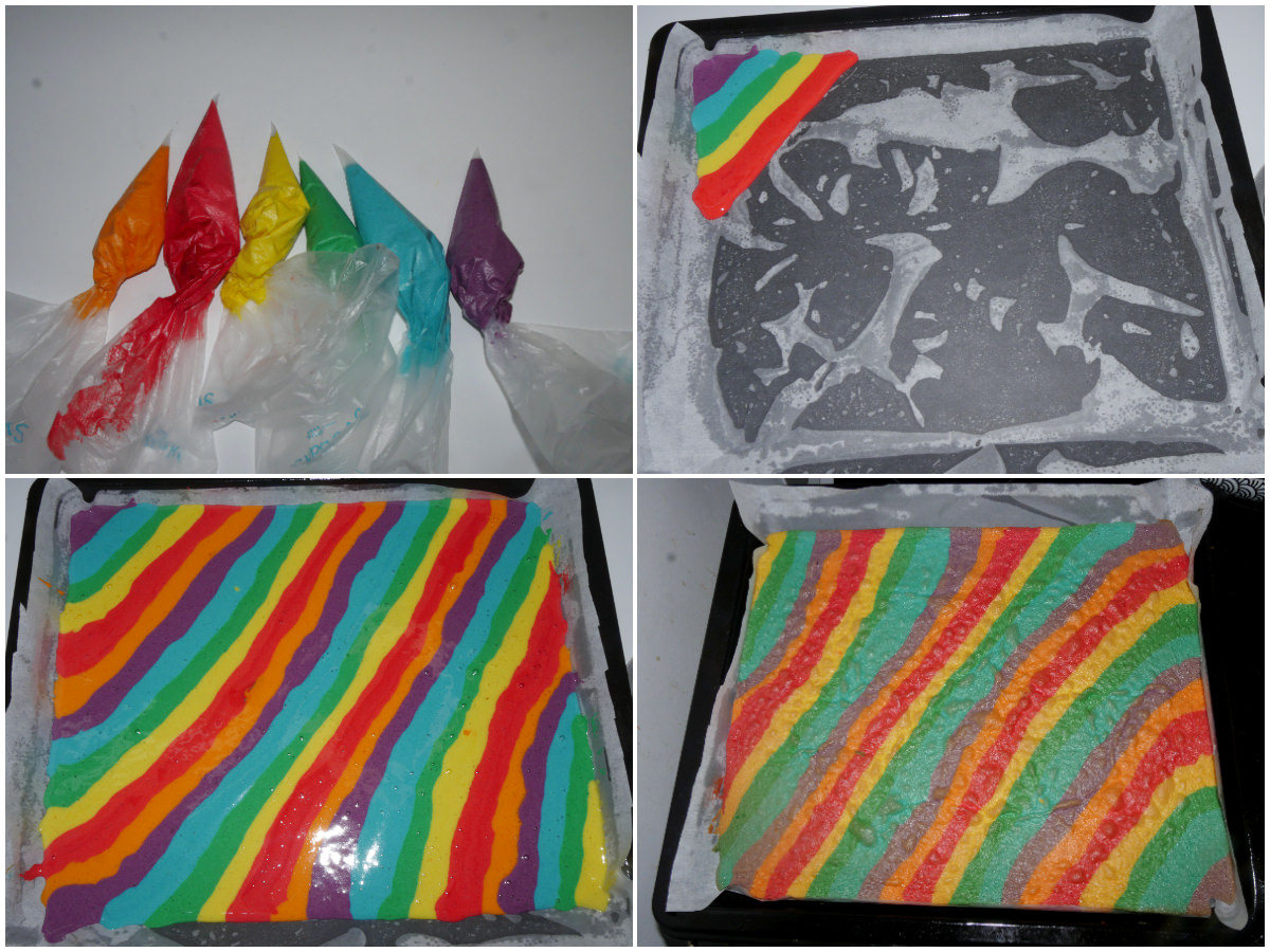 Versate i 6 diversi impasti in 6 diverse sac-à-poche e iniziate a creare la vostra base, sulla teglia rivestita di carta forno (per far sì che la mia carta forno non si muovesse, ho leggermente imburrato la teglia, prima di rivestirla con la carta), creando una striscia per colore, alternandoli: secondo me la resa maggiore viene data dalle strisce in diagonale, come ho fatto io, ma voi se volete potete farle anche in verticale (sconsiglio l'orizzontale, perché non vedreste tutti i colori a ogni fetta, che è la cosa più carina di questo dolce).