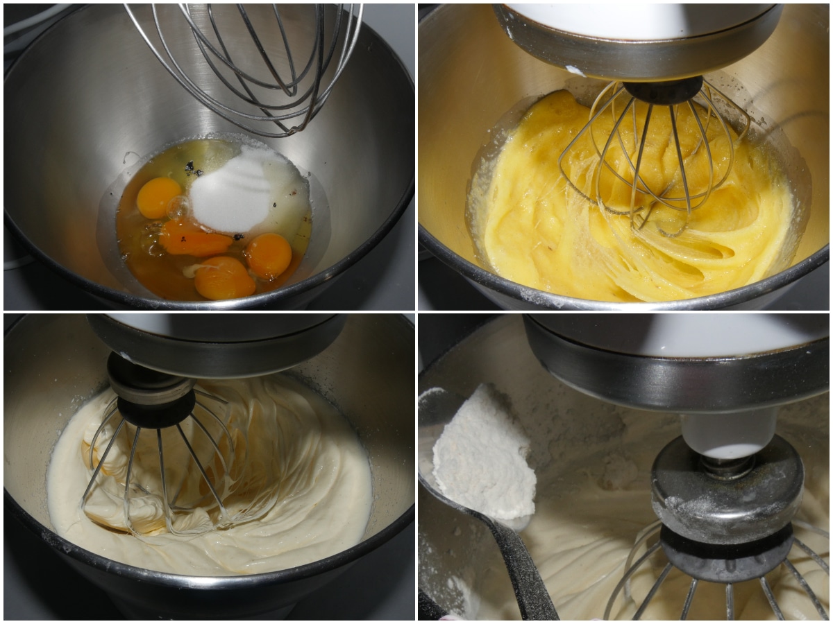 Montate le uova con zucchero e vaniglia per almeno 10 minuti, quindi incorporate la farina e il lievito setacciati insieme, 1 cucchiaio per volta.