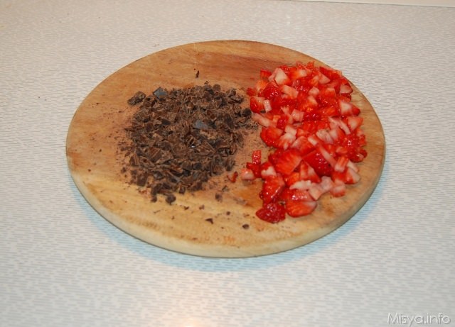 Montate ora la panna e tagliate il cioccolato e le fragole a pezzettini.