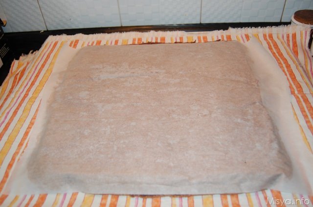 Capovolgere la pasta biscotto su un piano ricoperto di carta forno e staccare delicatamente la carta attaccata sulla base