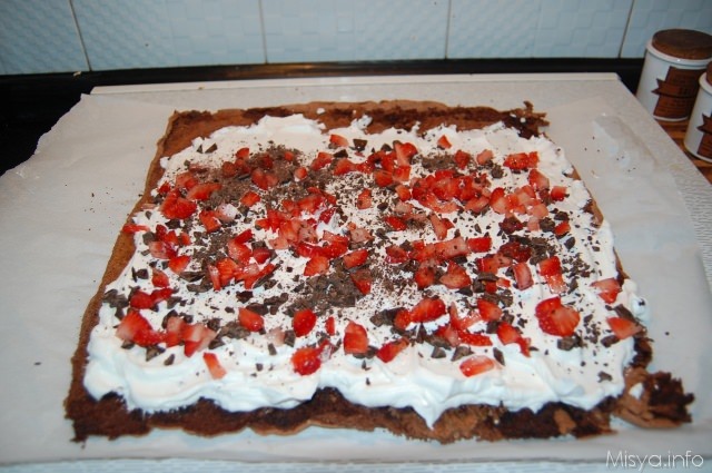 Stendete uno strato di panna sui 3/4 della superficie della pasta biscotto. Ricoprite con i pezzetti di fragola e quelli di cioccolato fondente