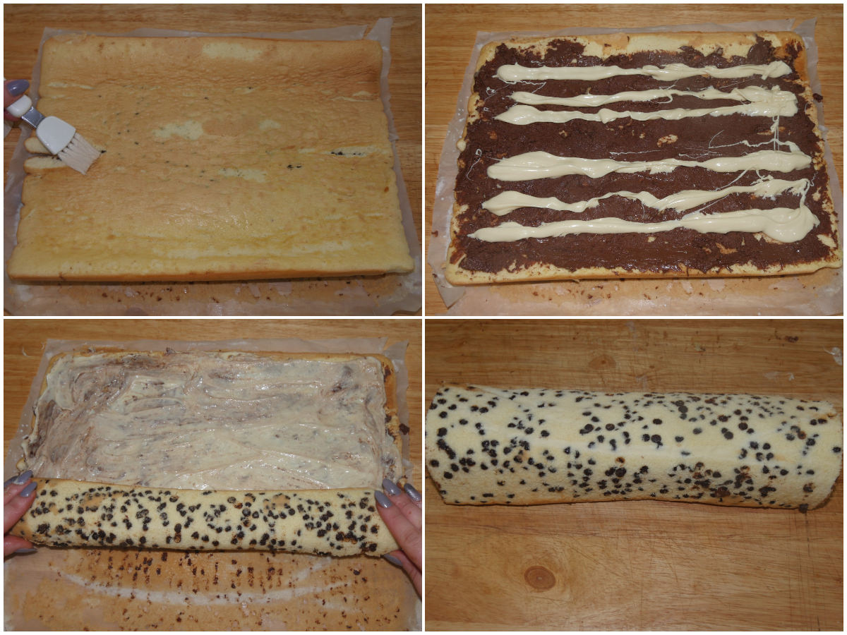 Riprendete la pasta biscotto, srotolatela delicatamente, spennellatela con un po' di latte e farcitela a piacere con le creme spalmabili, quindi arrotolatela nuovamente sul ripieno.
