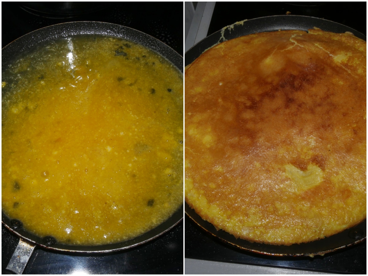 Cuocete la frittata normalmente in una padella antiaderente ampia, in modo da ottenere una frittata abbastanza sottile, con un filo d'olio e girandola una volta che la superficie si sarà rappresa.