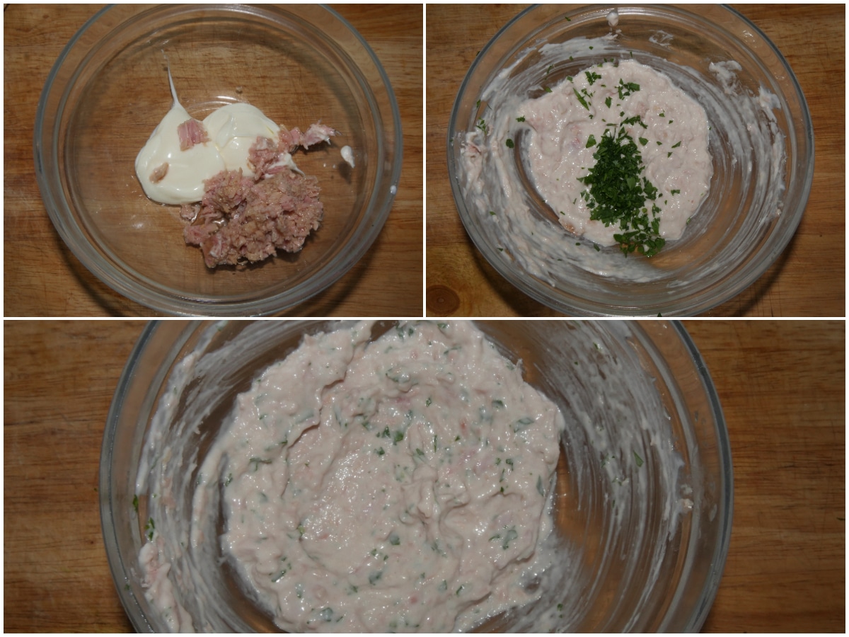 Lasciate intiepidire la frittata e nel frattempo mescolate il tonno con maionese e prezzemolo tritato.