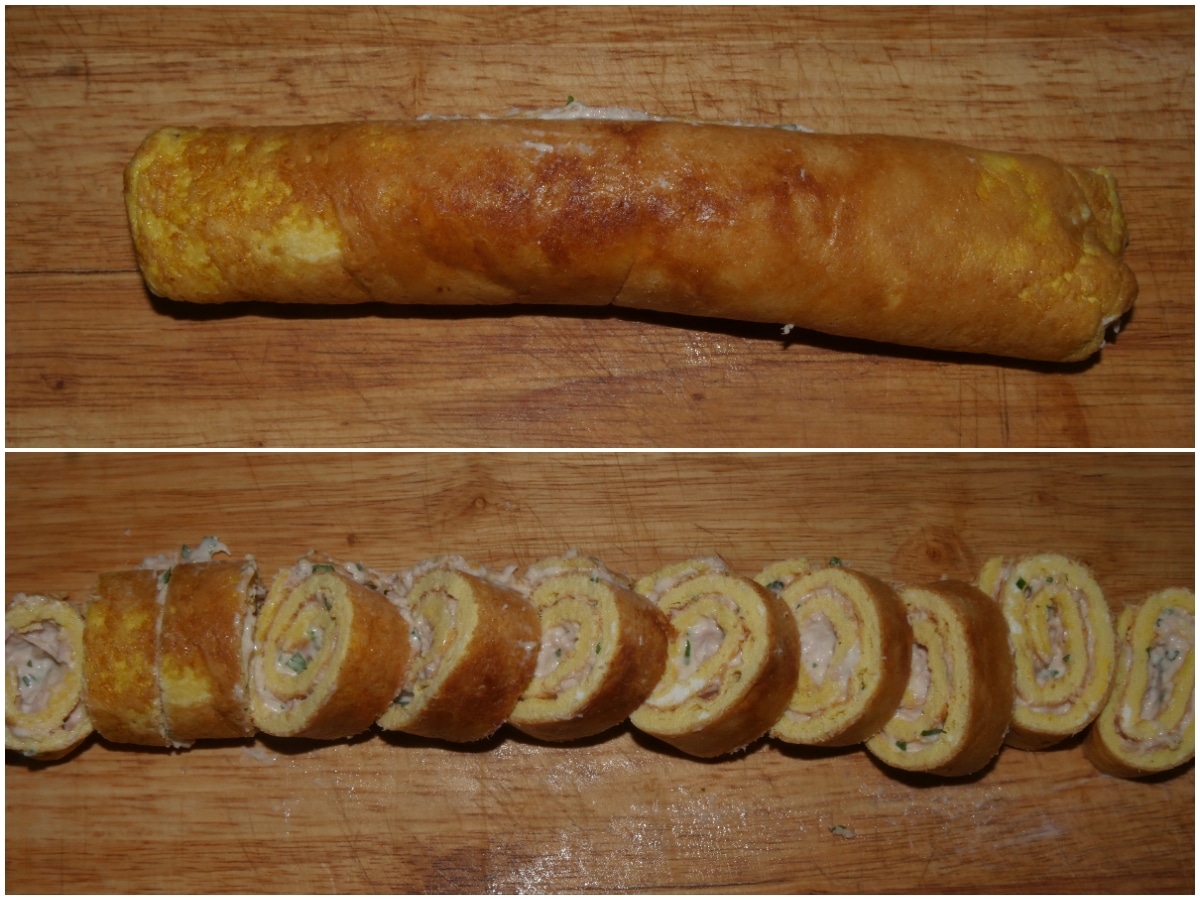 Distribuite la farcitura sulla frittata, quindi arrotolatela e chiudetela con carta di alluminio o pellicola per alimenti e lasciate riposare in frigo per almeno 30 minuti..