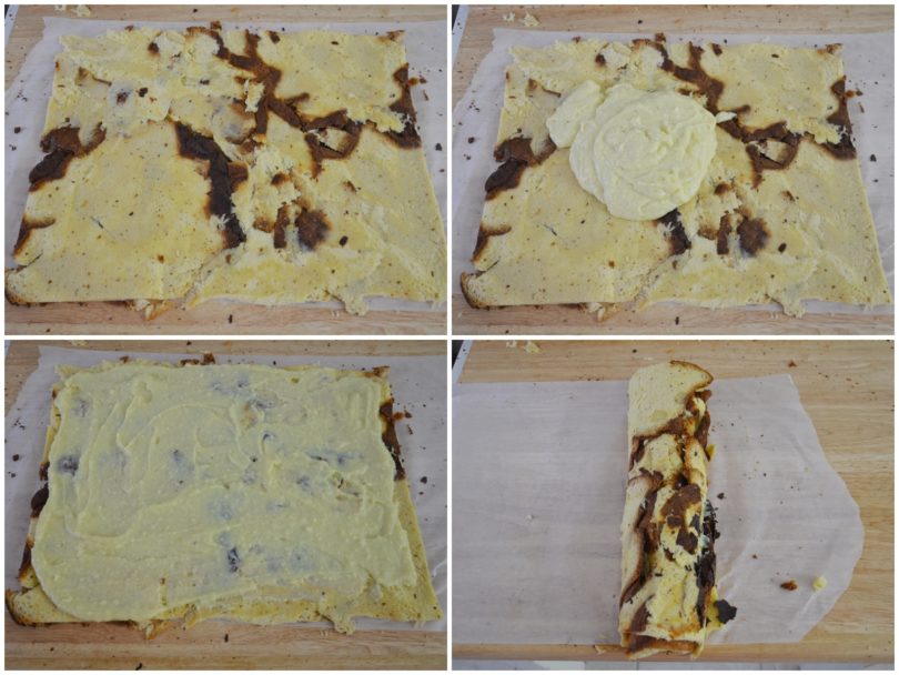 Farcite ora con la crema al rum livellando la crema il più possibile.Arrotolate dalla parte più lunga, aiutandovi con la carta forno così da formare un rotolo.