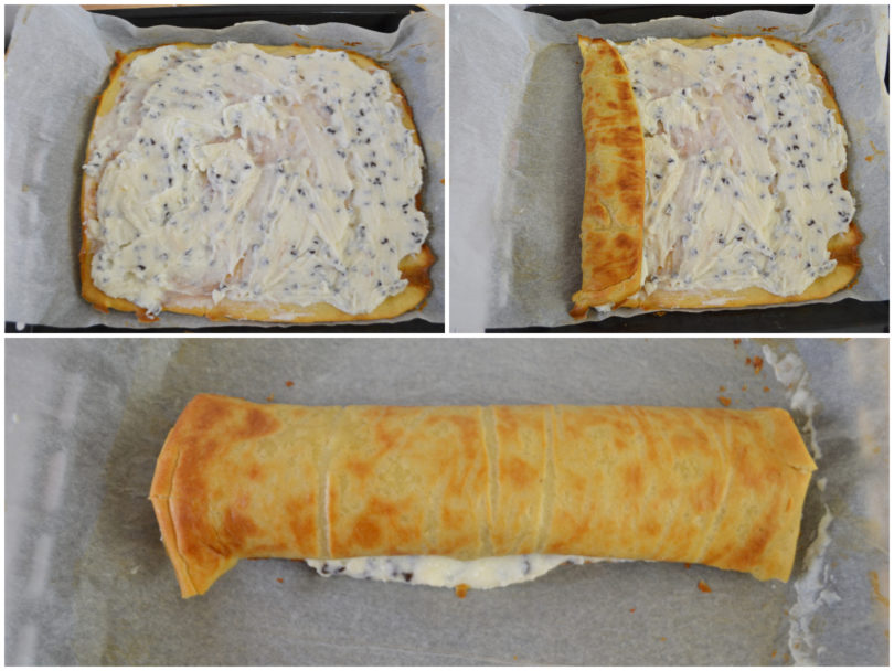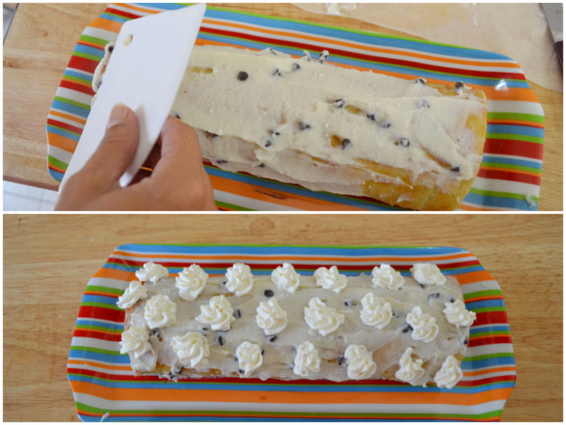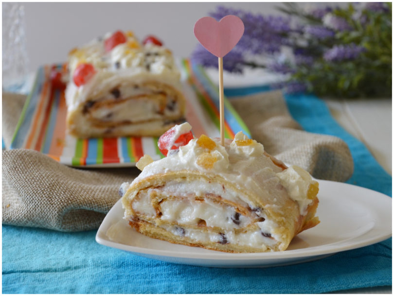 Srotolate la pasta bignè, farcitela con la crema di ricotta e gocce di cioccolato quindi avvolgete.