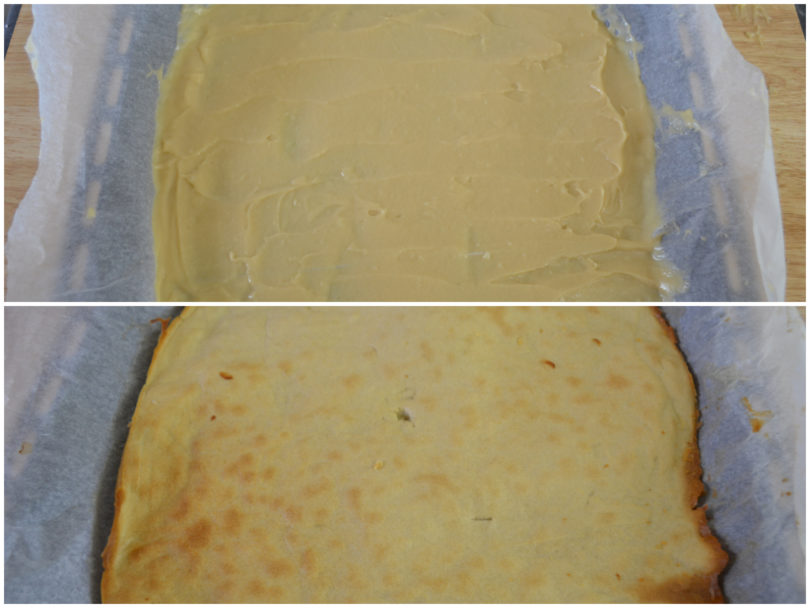 Spalmate ora il composto su una leccarda foderata da carta forno. Cuocete in forno statico preriscaldato a 180° con il forno leggermente aperto in modo da far uscire l’umidità. Dopo 15 minuti abbassate la temperatura a 160° e fate cuocere ancora 10/15 minuti. Una volta cotto, lasciate il rotolo nel forno 10 minuti poi estraetelo e fatelo raffreddare avvolgendolo nella stessa carta forno utilizzata per la cottura.
