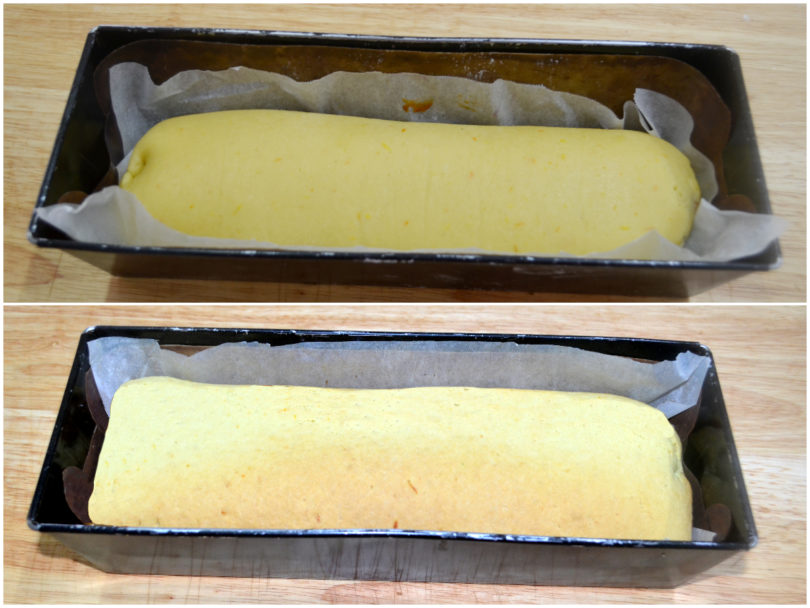 Trasferite con delicatezza il rotolo, con tutta la carta forno, in uno stampo da plumcake e cuocete a 180°C per 35-40 minuti in forno ventilato già caldo.