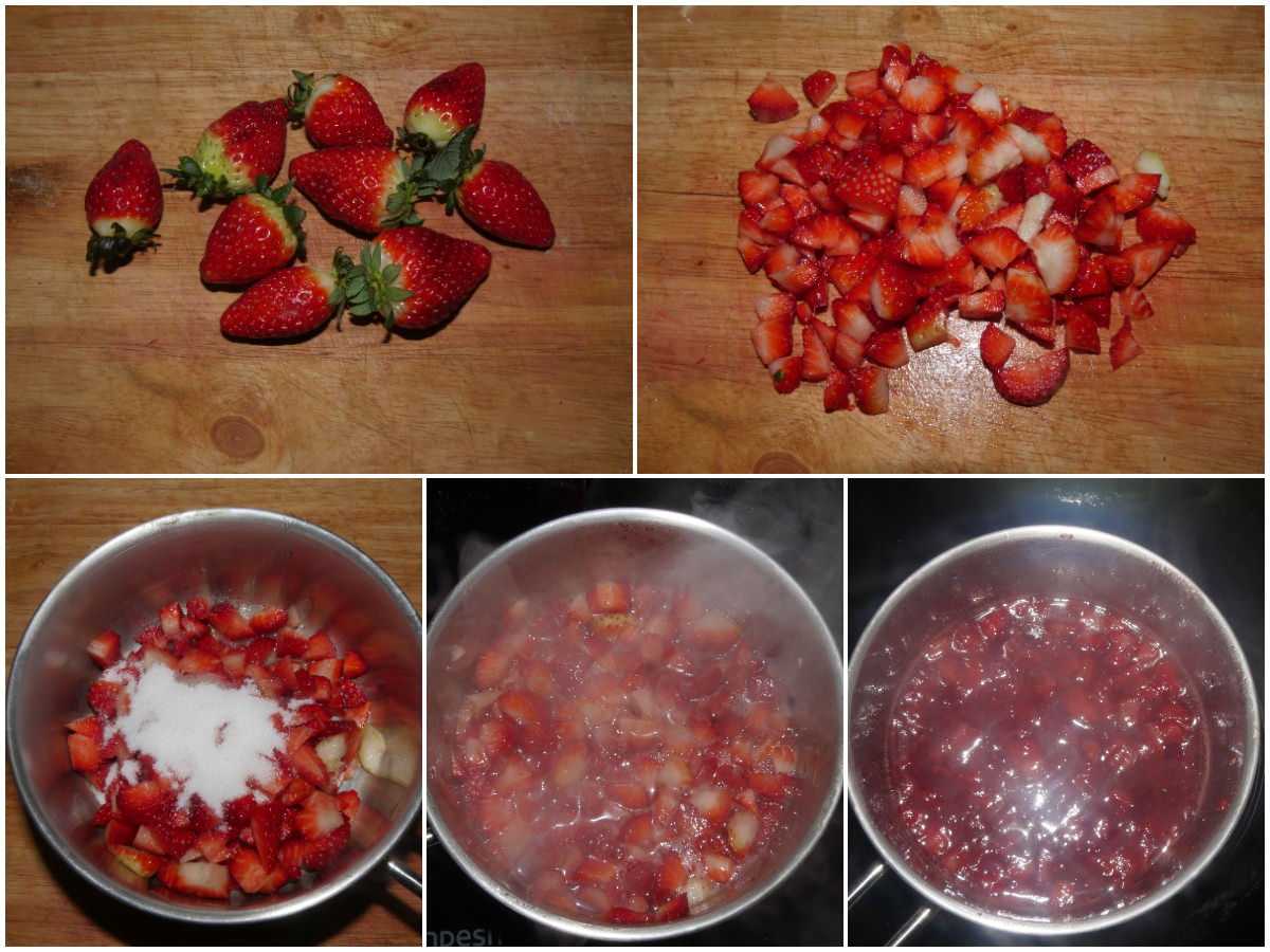 Mondate le fragole, lavatele e tagliatele a cubetti, quindi mettetele in una casseruola con zucchero e succo di limone e cuocete per 5-10 minuti, finché le fragole non si saranno ammorbidite e non si sarà creato un meraviglioso sciroppo: lasciate raffreddare.