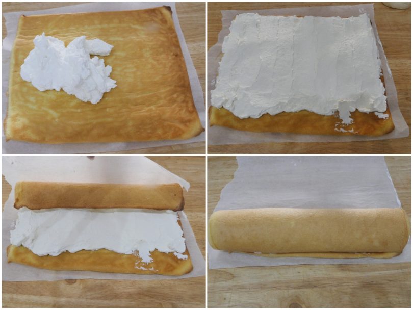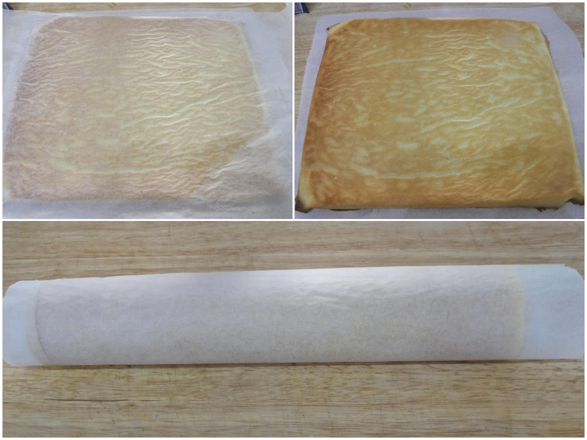 Sfornate la pasta biscotto, capovolgetela su un secondo foglio di carta forno, eliminate il primo foglio, arrotolate delicatamente e lasciate raffreddare così.