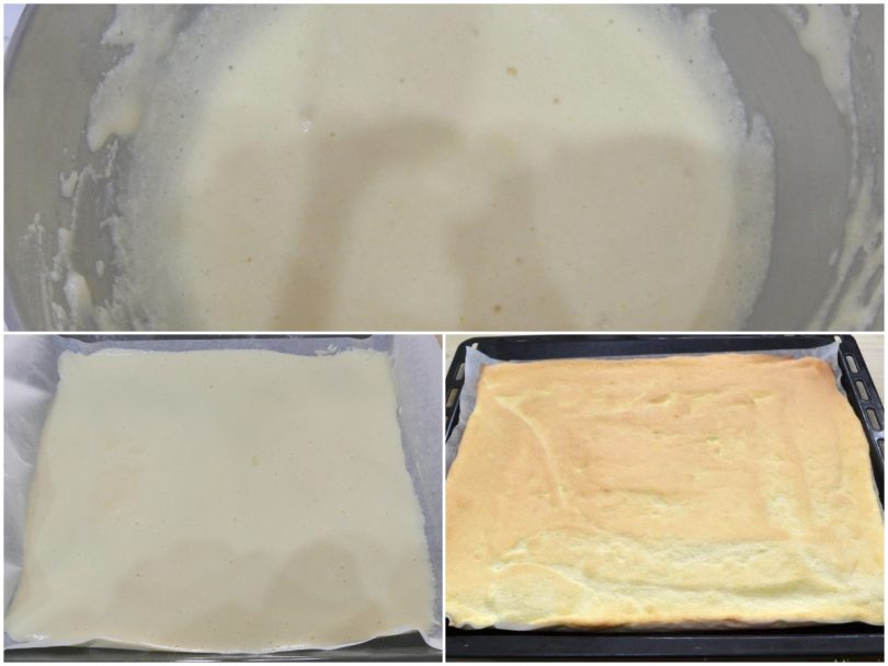 Versate il composto così ottenuto sulla teglia del forno rivestita di carta forno, livellate bene la superficie e cuocete per 9-10 minuti a 190°C, in forno statico già caldo.