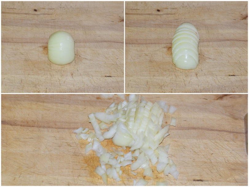 Mondate e tritate la cipolla, quindi fate lo stesso con basilico e aglio.