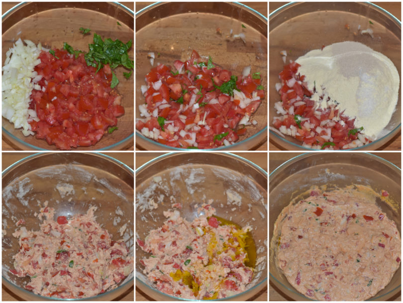 Unite tutto in una ciotola (compreso il sughetto rilasciato dai pomodori durante il taglio), mescolate, poi incorporate farina, sale e lievito, infine anche olio.