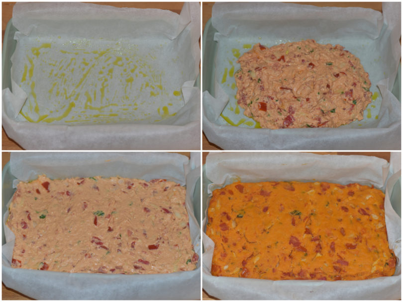 Rivestite la teglia con carta da forno, ungete con un po' di olio, quindi trasferiteci dentro l'impasto, livellate la superficie e lasciate riposare per altri 20 minuti mentre preriscaldate il forno.